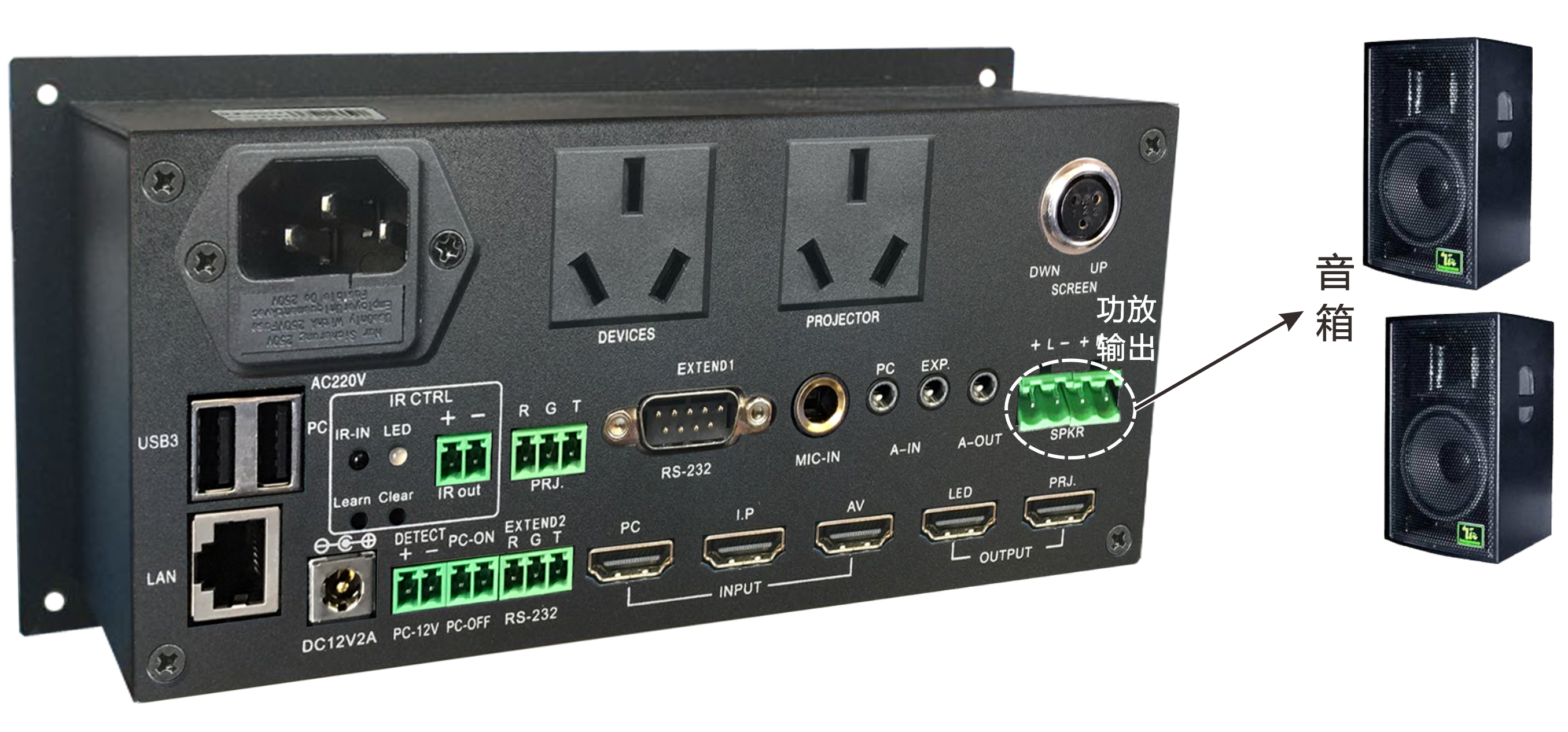 3路強(qiáng)電輸出,可供投影機(jī)、銀幕及電腦等設(shè)備。